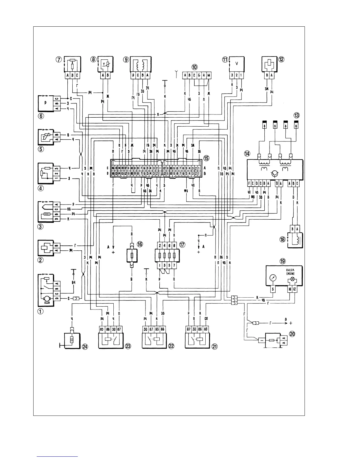 and «CHECK ENGINE» light; 20 - main fusebox; 21 - ignition relay; 22 - fuel pump cut-in relay; 23 - intake manifold preheater relay; 24 - intake manifold preheater;