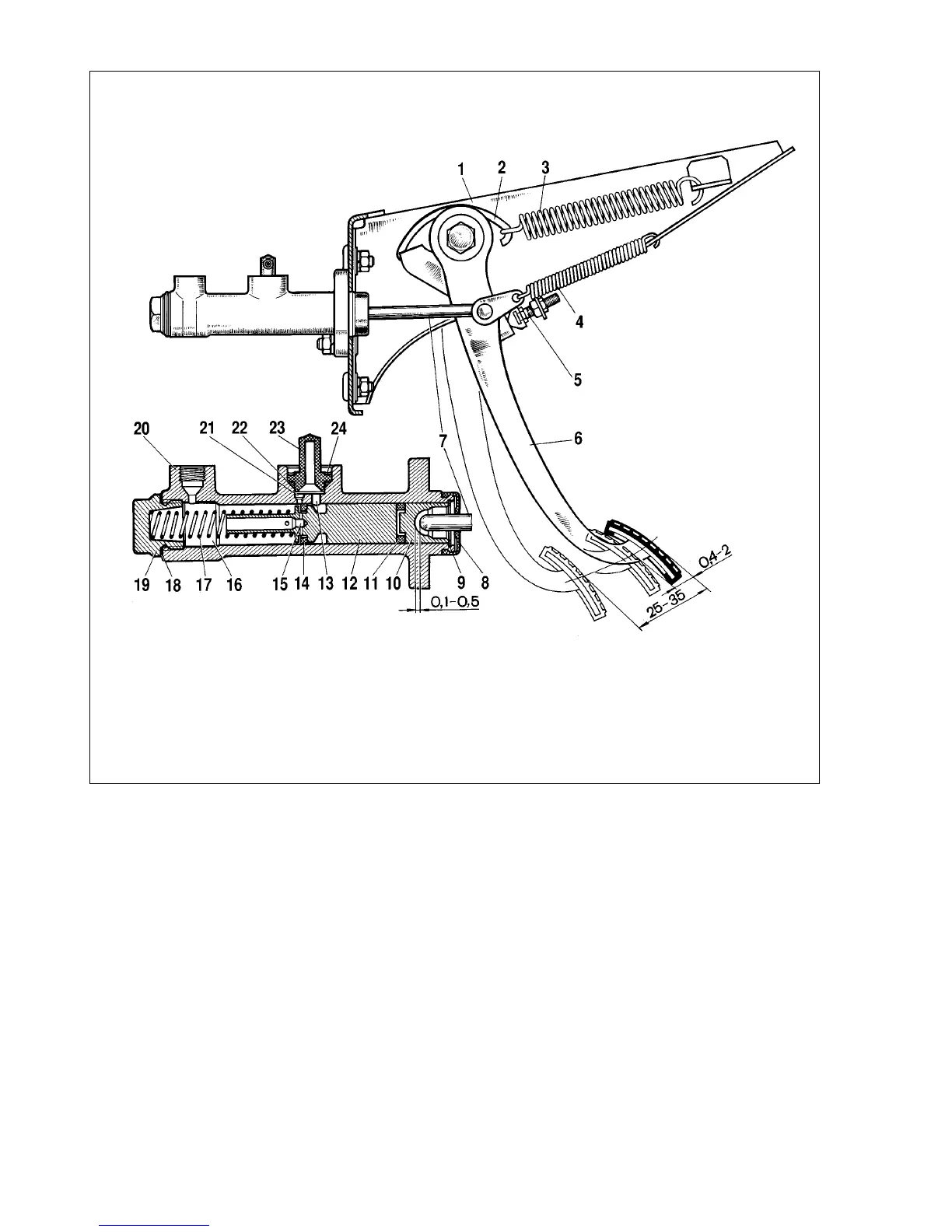 1 - pedal cluster mounting bracket; 2 - clip; 3 - clutch pedal servo spring; 4 - clutch pedal return spring; 5 - clutch pedal limiter bolt; 6 - clutch pedal; 7 - pushrod;