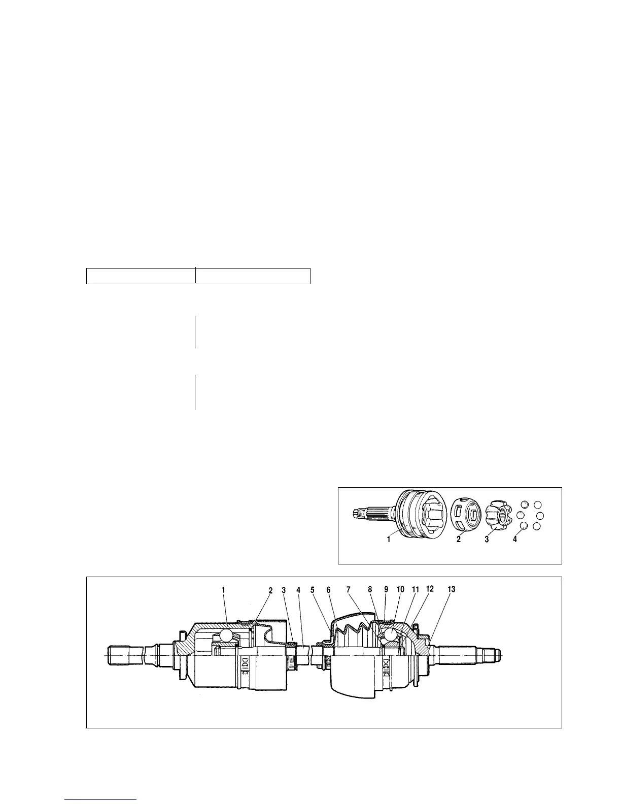 1 - inner joint housing; 2 - circlip; 3 - boot clamp; 4 - wheel drive shaft; 5 - shroud; 6 - boot; 7 - race thrust ring; 8 - cage; 9 - clip; 10 - ball; 11 - outer joint holder; 12 - cir-