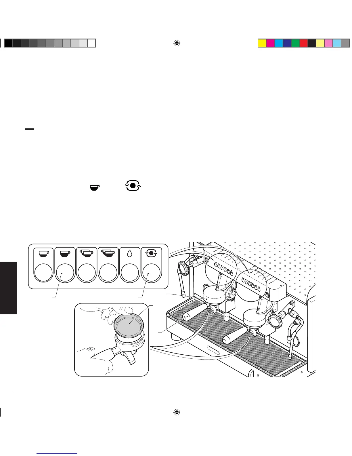• Den Siebträger (1) mit dem Blindsieb wieder in die Maschine einsetzen und den Zyklus wie oben beschrieben wiederholen.