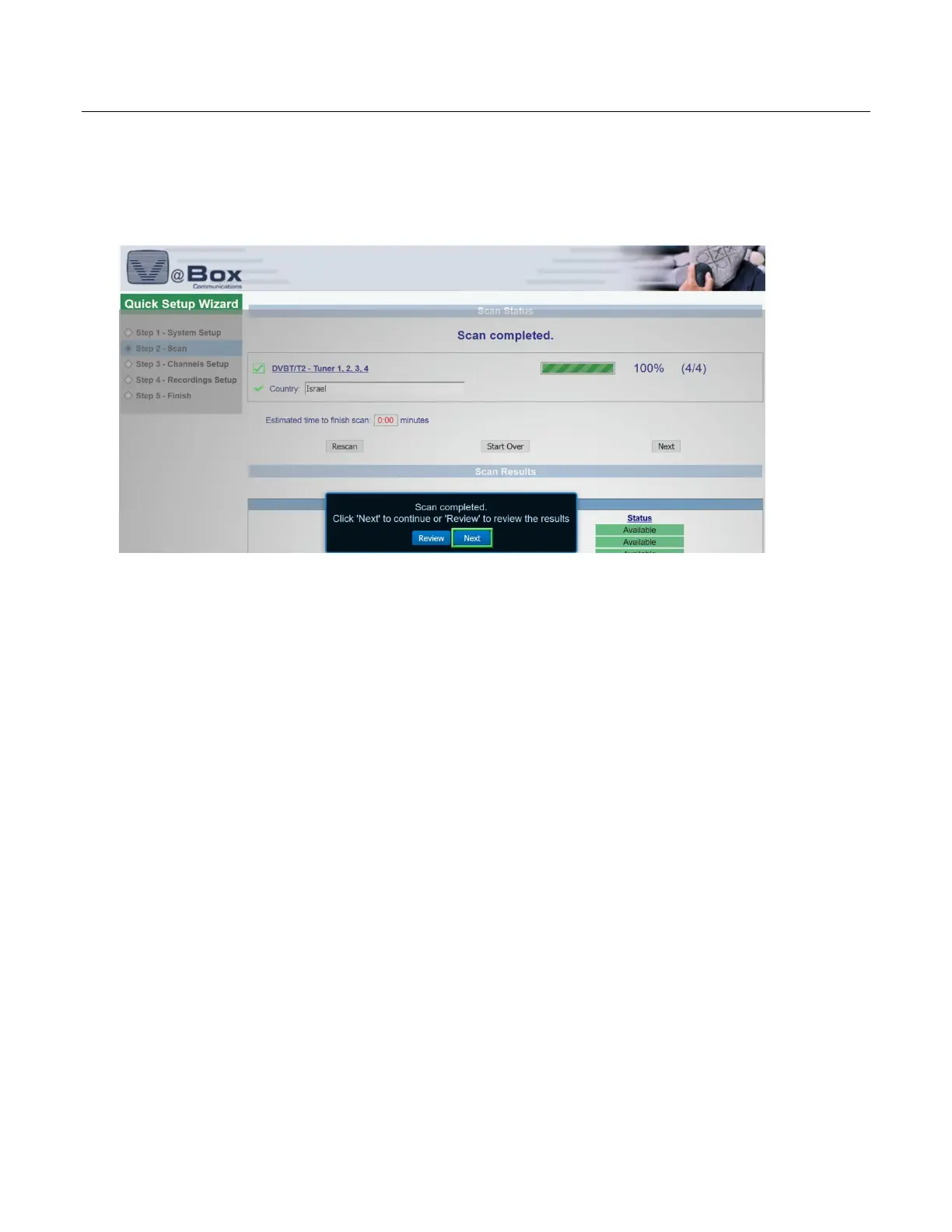 Figure 8: Quick Setup Wizard – Step 2 –Scan: Scan Status and Results page (XTi-4144/74 models)