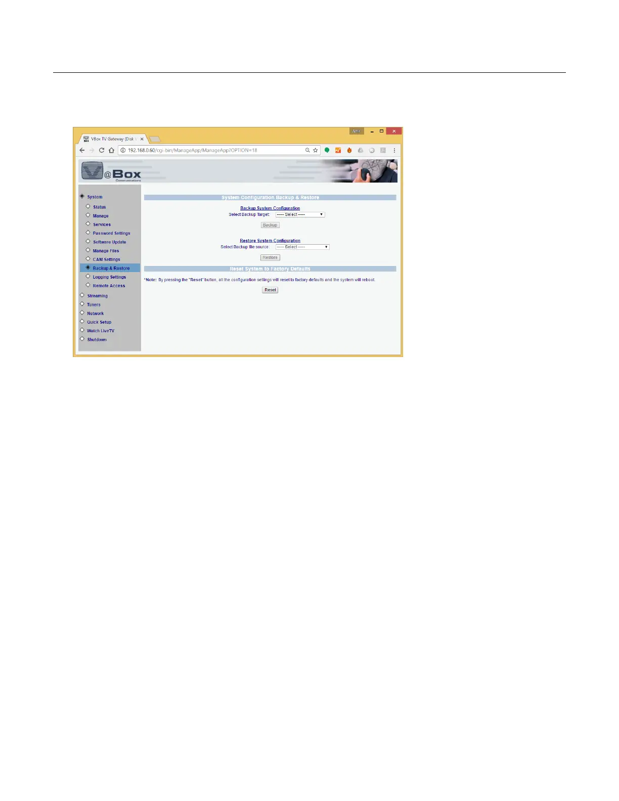 This backup snapshot is saved in the device’s memory, and it will be erased when resetting the VBox to