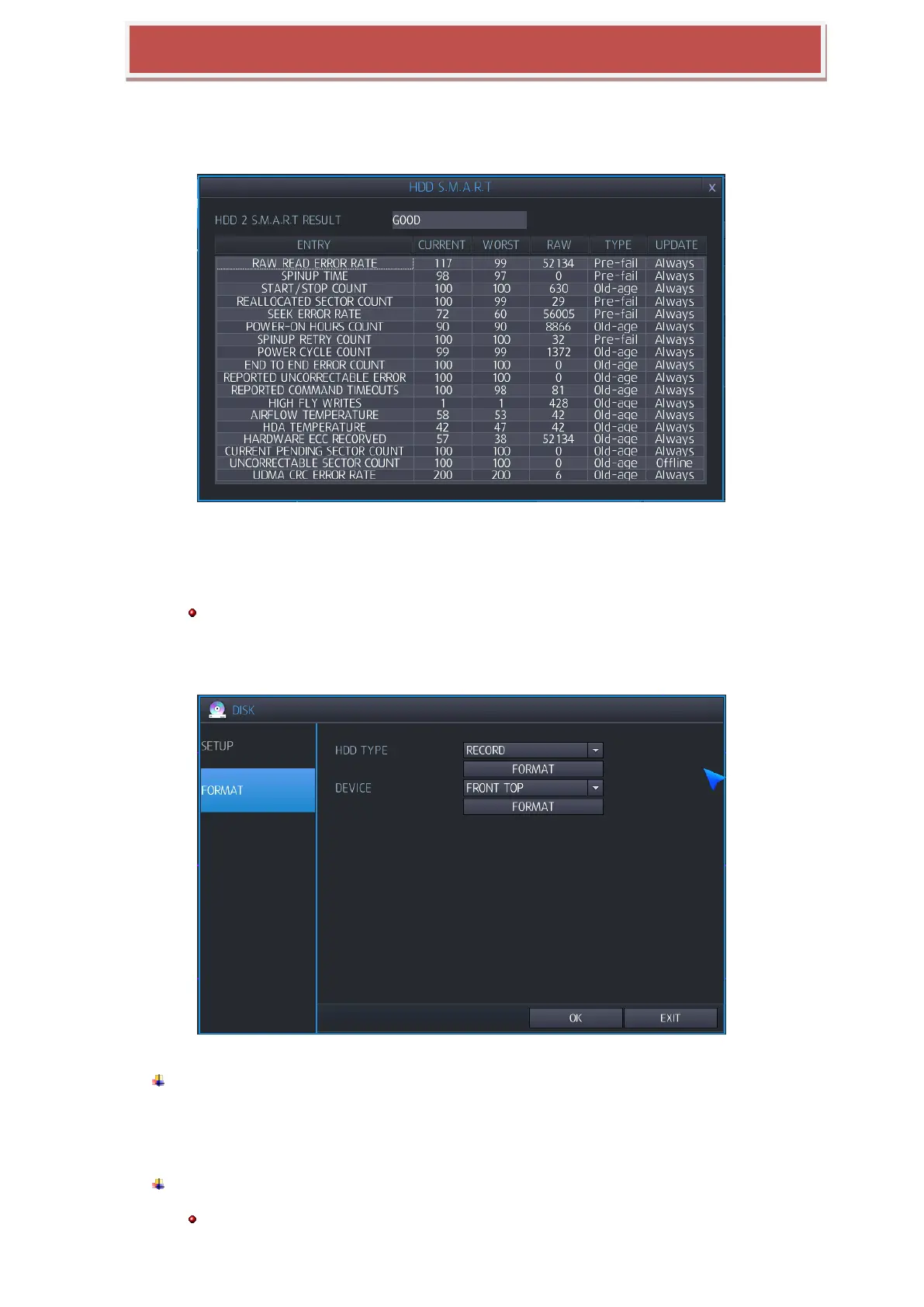 S.M.A.R.T: You can view HDD‟s user configuration connected to HYBRID-DVR and