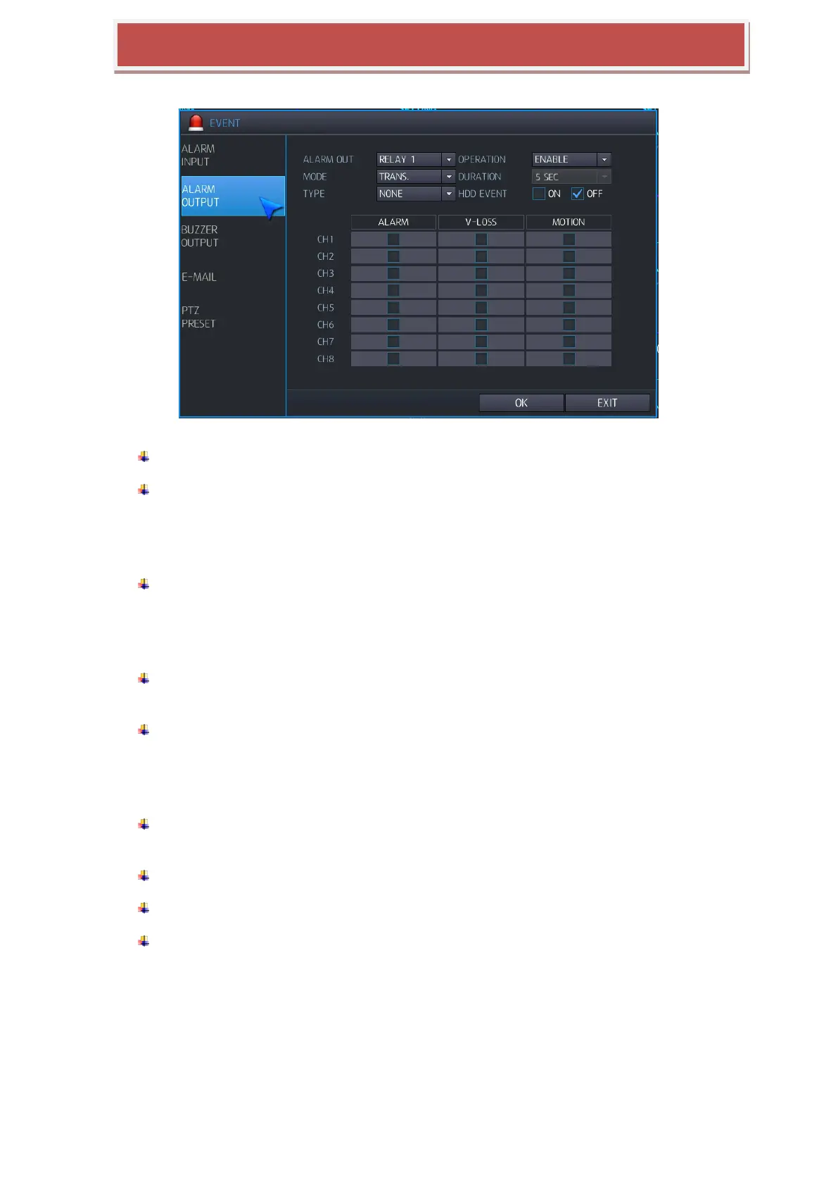 ALARM OUT : You can select Relay for the operation to be configure