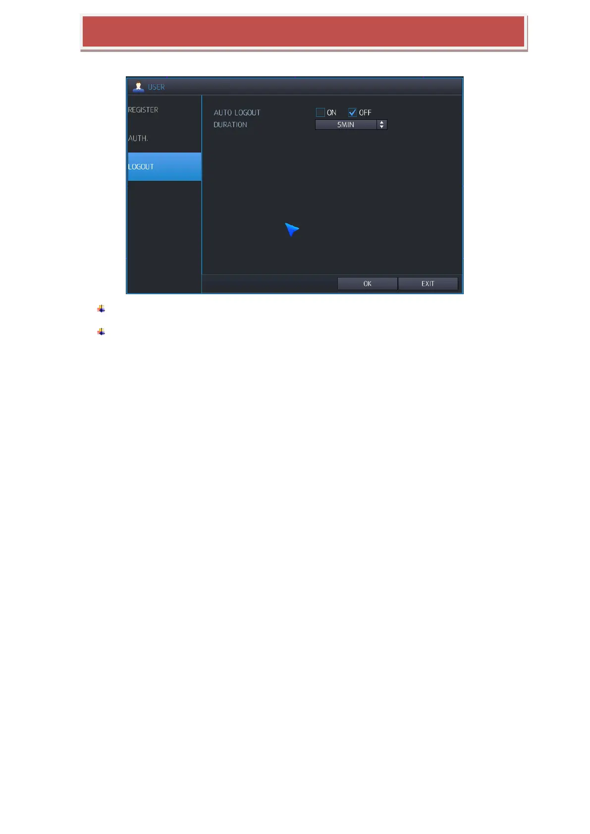 AUTO LOGOUT: Selects if auto log-out is ON or OFF.