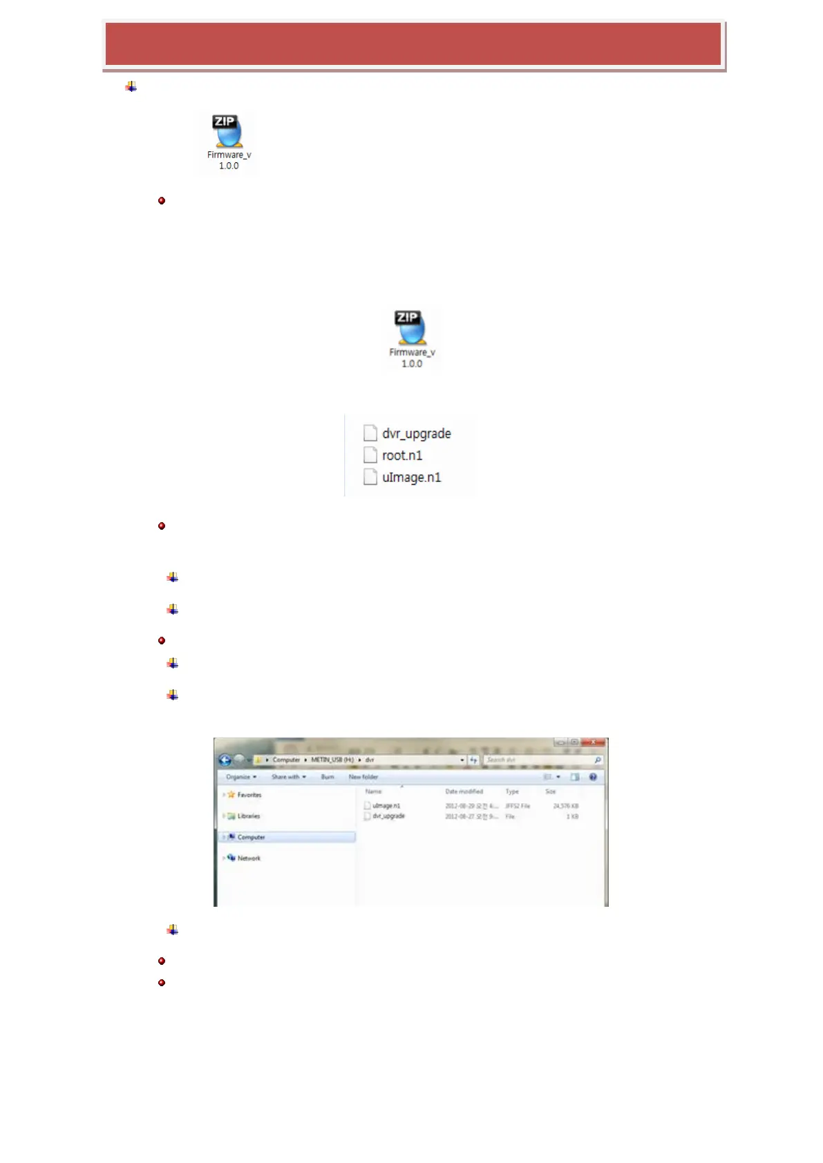 Copy the released F/W zip file into the „dvr‟ folder in the USB thumb drive.