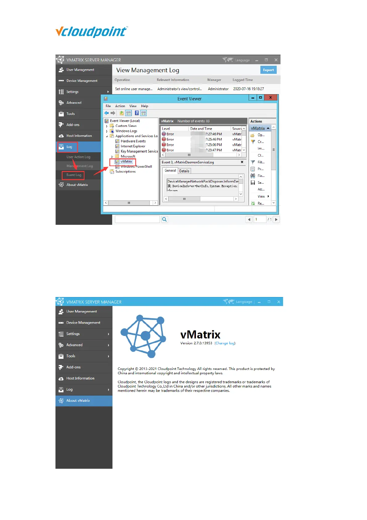 This page displays the current version of vMatrix Server Manger and contains a change log