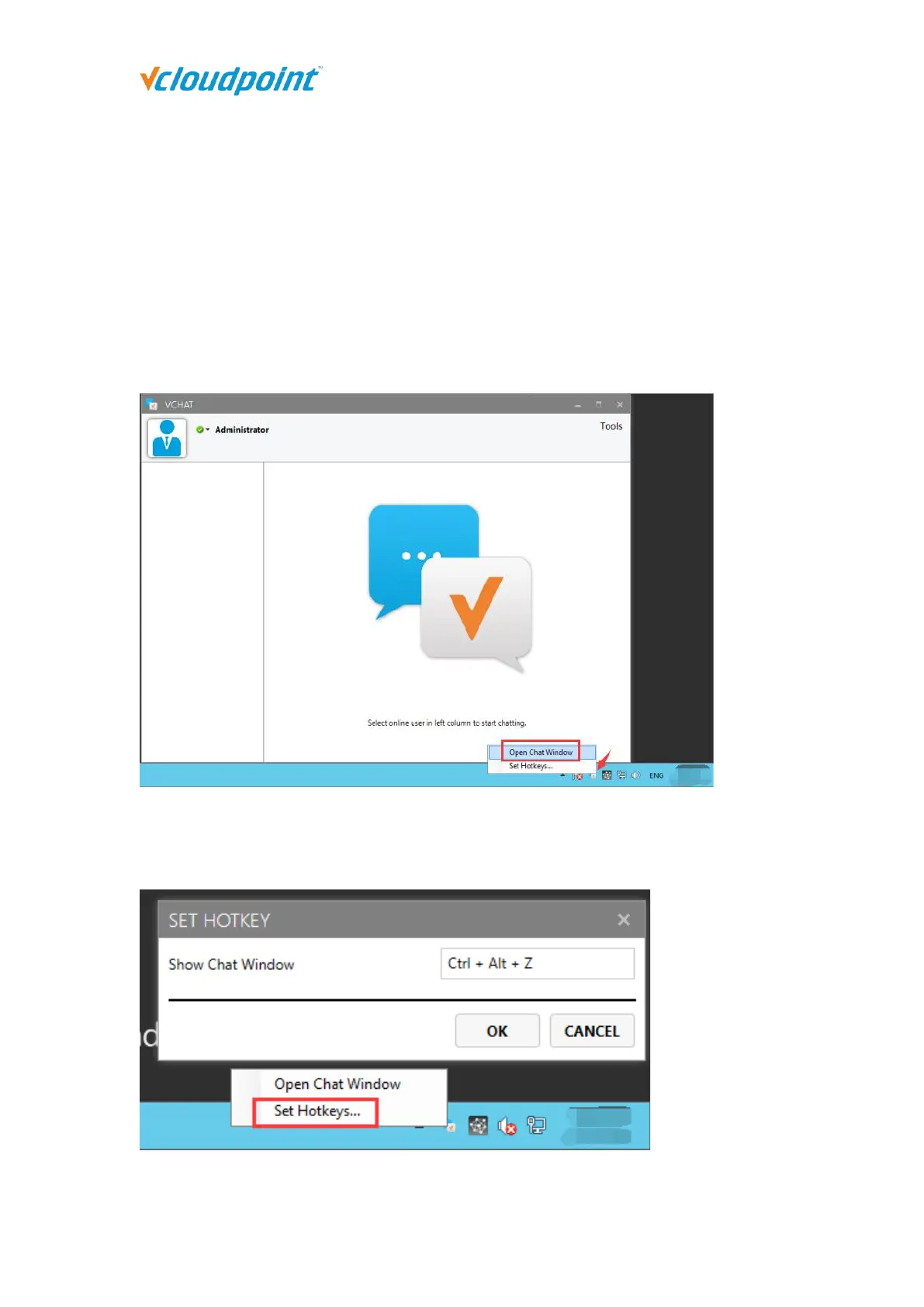 Set the hotkey to open the chat tool. Right-click the vChat icon at the task bar, and