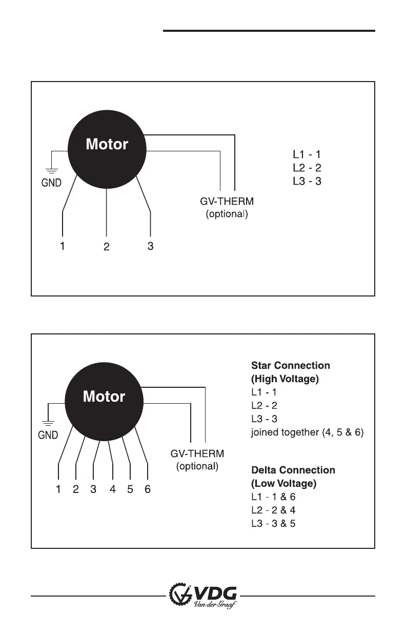 VDG TM100B25 - Single Voltage Three Phase Wiring; Dual Voltage Three Phase Star Delta Wiring