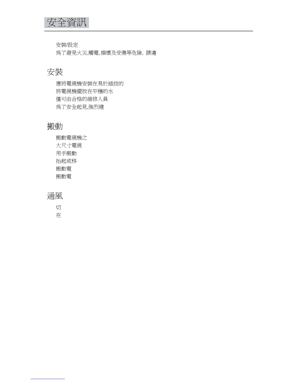 為了避免火災,觸電,損壞及受傷等危險, 請遵照下列指示來安裝和使用電視機。