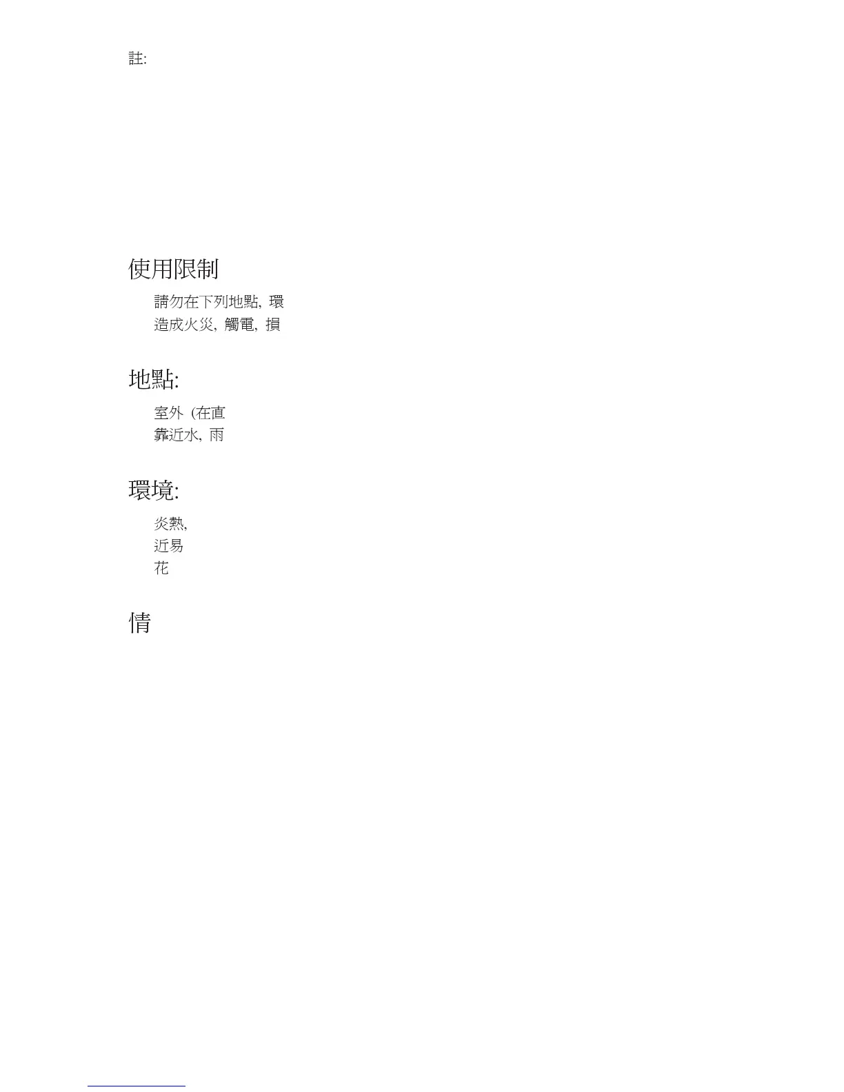 請勿在下列地點, 環境或情況條件下安裝 / 使用電視機, 否則電視機可能會發生故障並