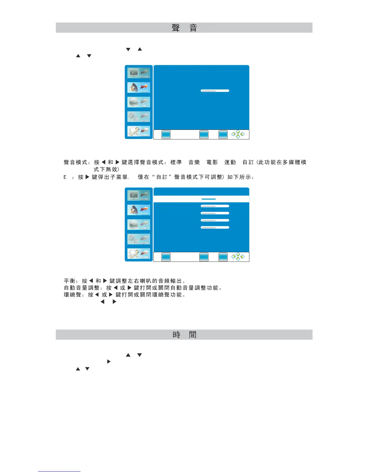 VDigi 32E200SQB - Sound Menu; Sound Mode & Equalizer; Volume & Surround Sound; Time Menu