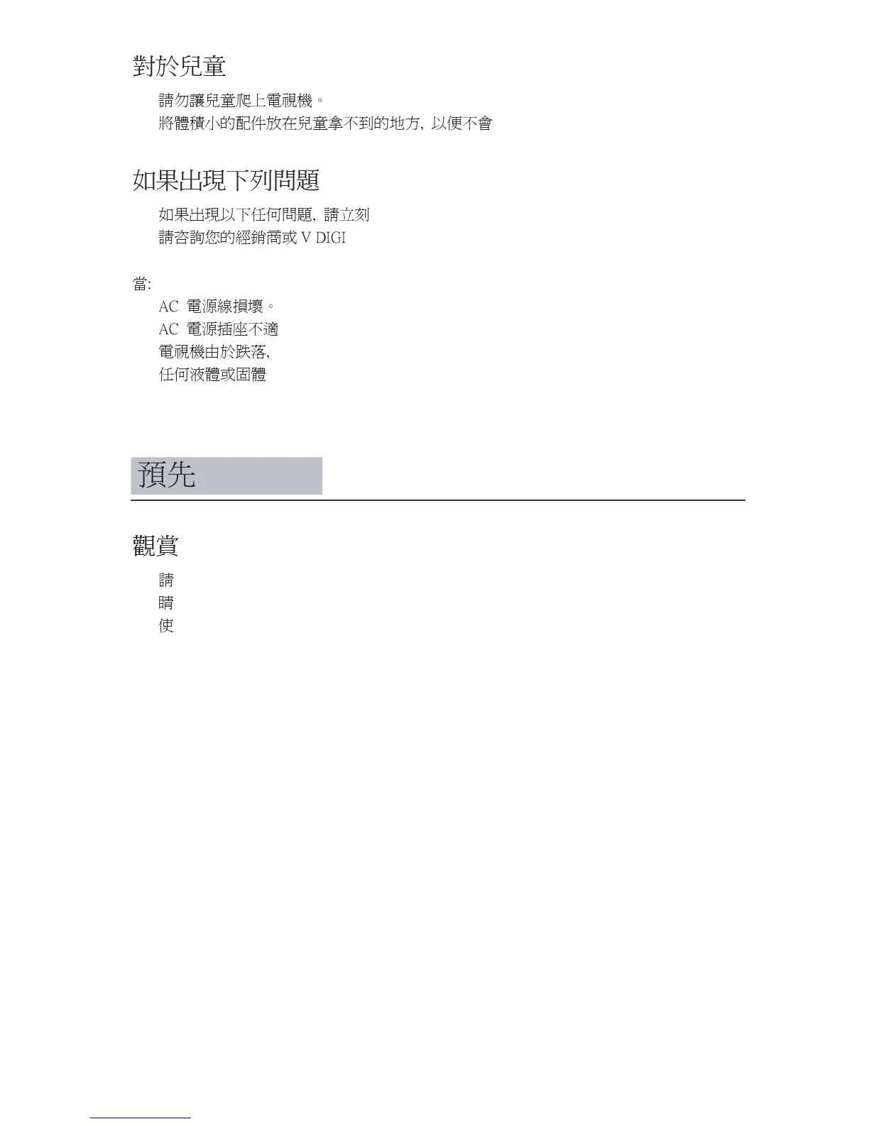 請在適當光線條件下觀賞電視, 因為在光線不足條件下或長時間觀賞電視會損傷您的眼