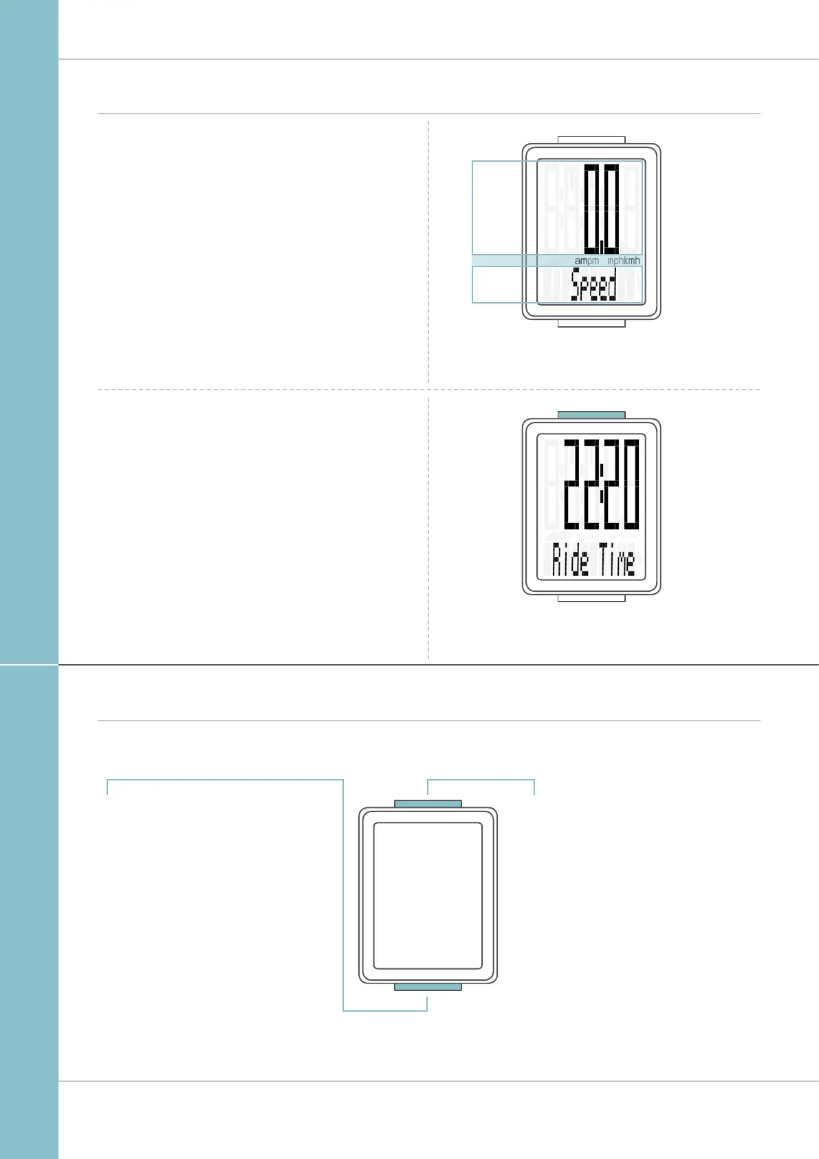– The middle line displays “am” or “pm” if the 12-hour