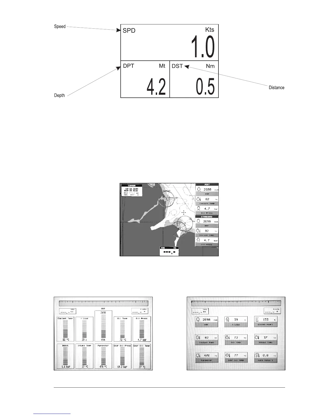Engine Data will be displayed according to the setting of the chart plotter, i.e.: