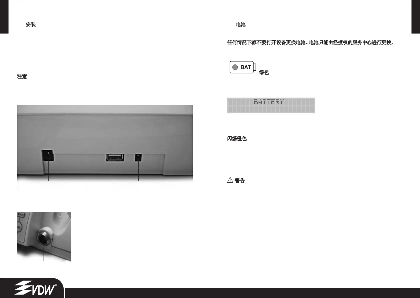 请 勿 尝 试 打 开 设 备 更 换 电 池 。由 于 可 能 发 生 短 路 , 这样操作将非常危险。如果自行打