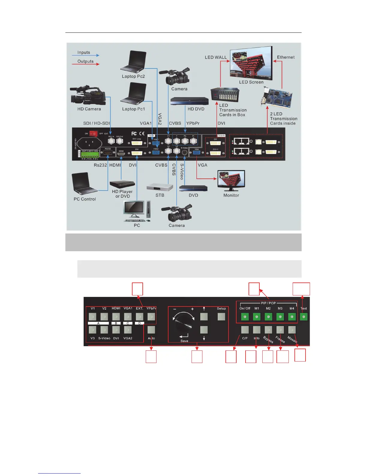 1) Input selecting buttons (V1, V2, V3, S-Video, DVI, VGA1, VGA2, YPbPr,