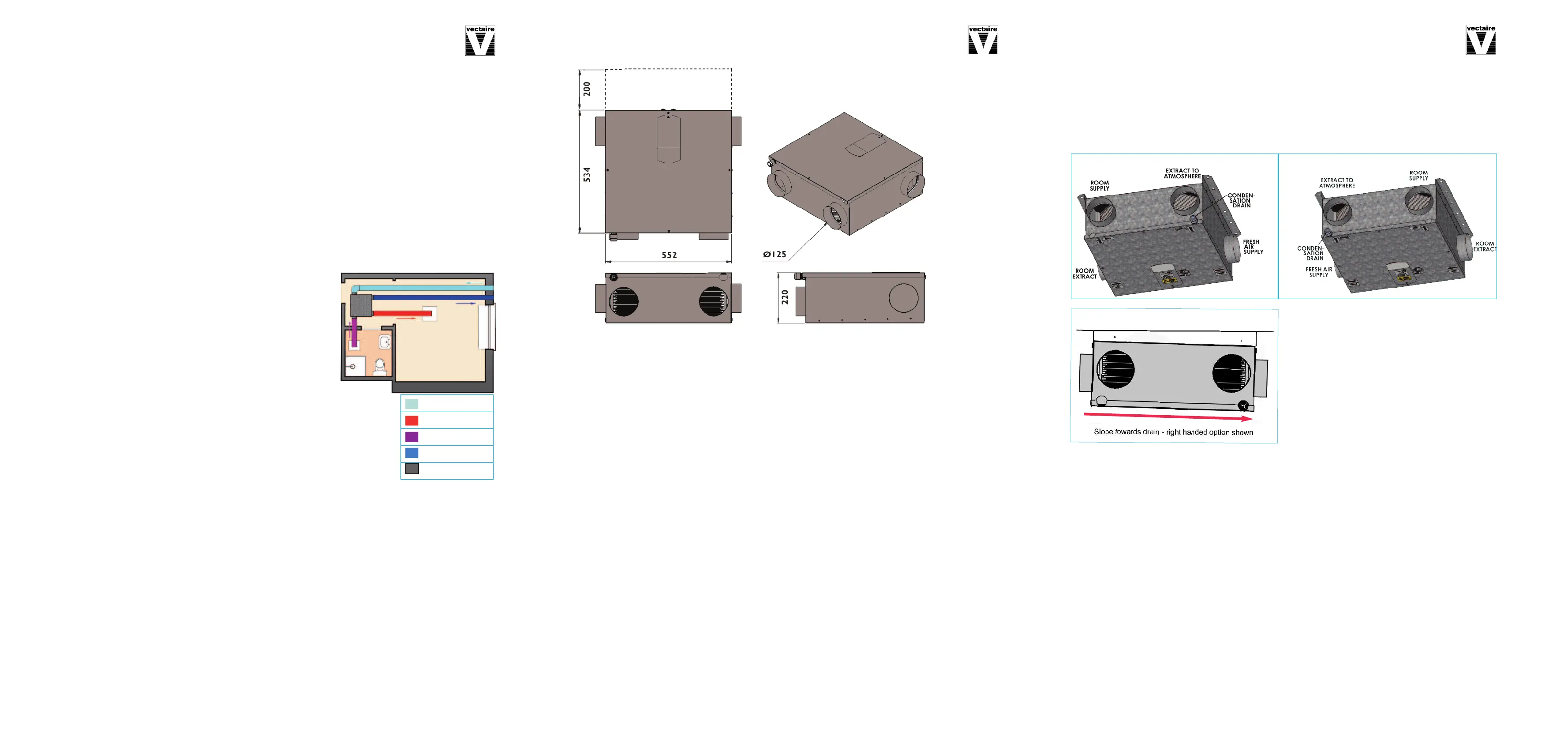 and condensate drain route. The four spigots on the unit are marked for the four unique connections. The