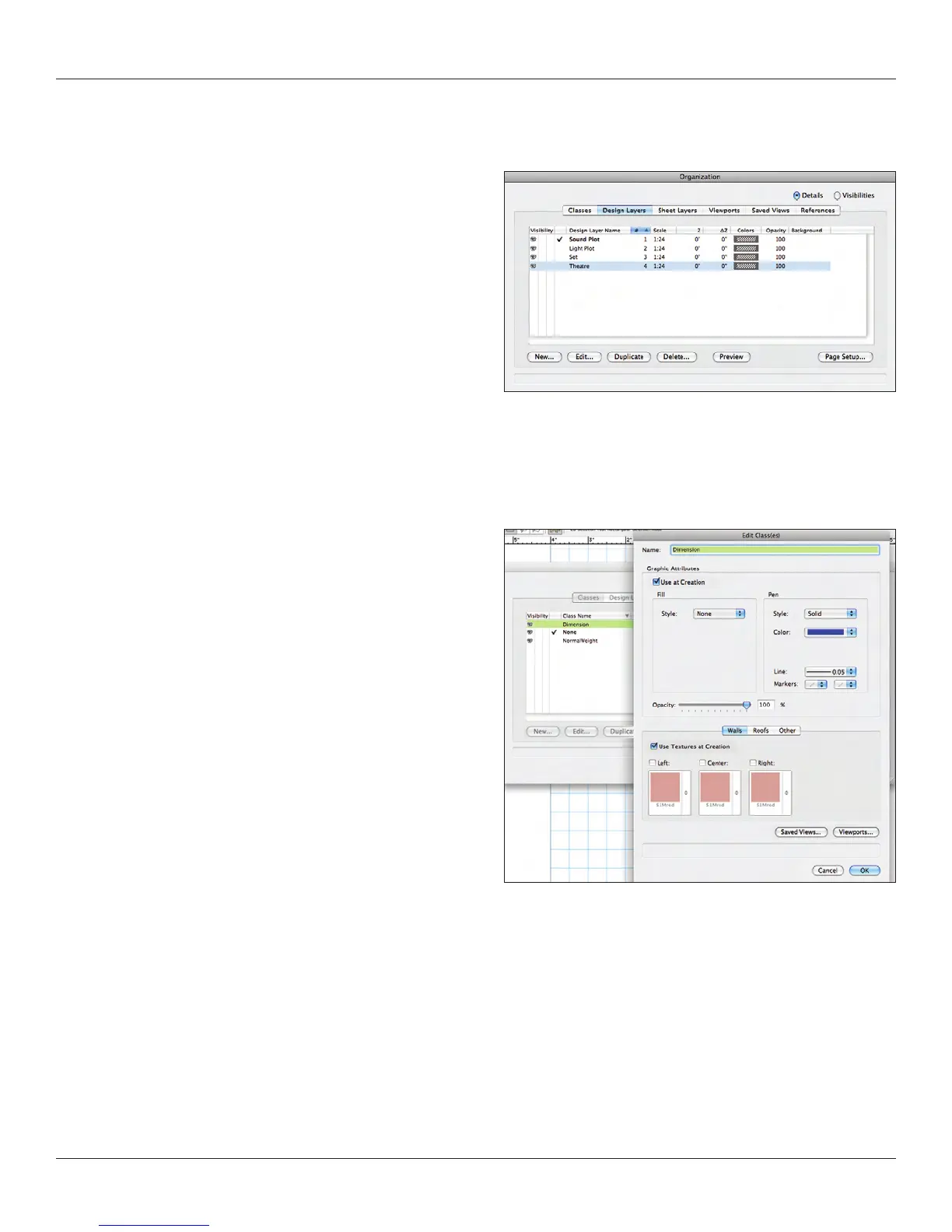 distinguish oors of a building. Many theatrical designers create layers for the theatre, the set, the light plot, and the sound plot. Each