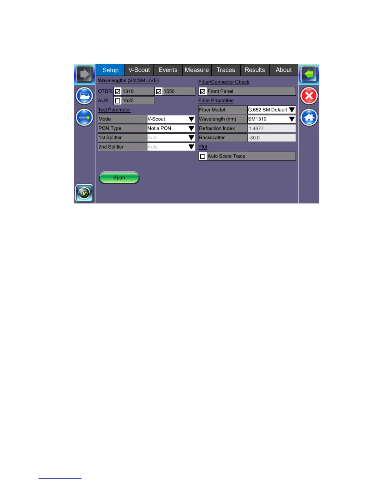 Use the top tabs of the FX150 screen to access test measurement controls and view results.