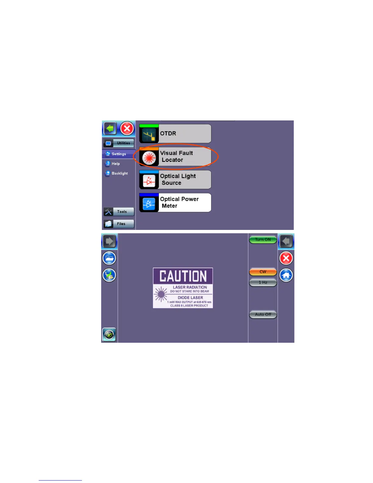 4. Press Visual Fault Locator on the main menu. The Caution screen appears.