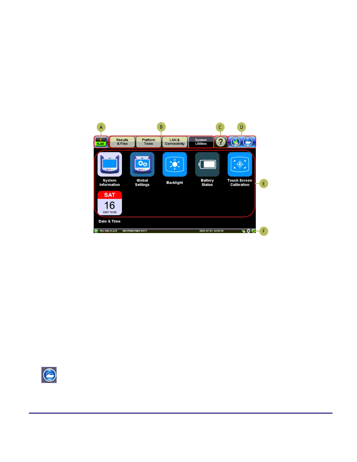 F: Connection Status Displays the status of external connections, i.e. Bluetooth, WiFi, power supply.