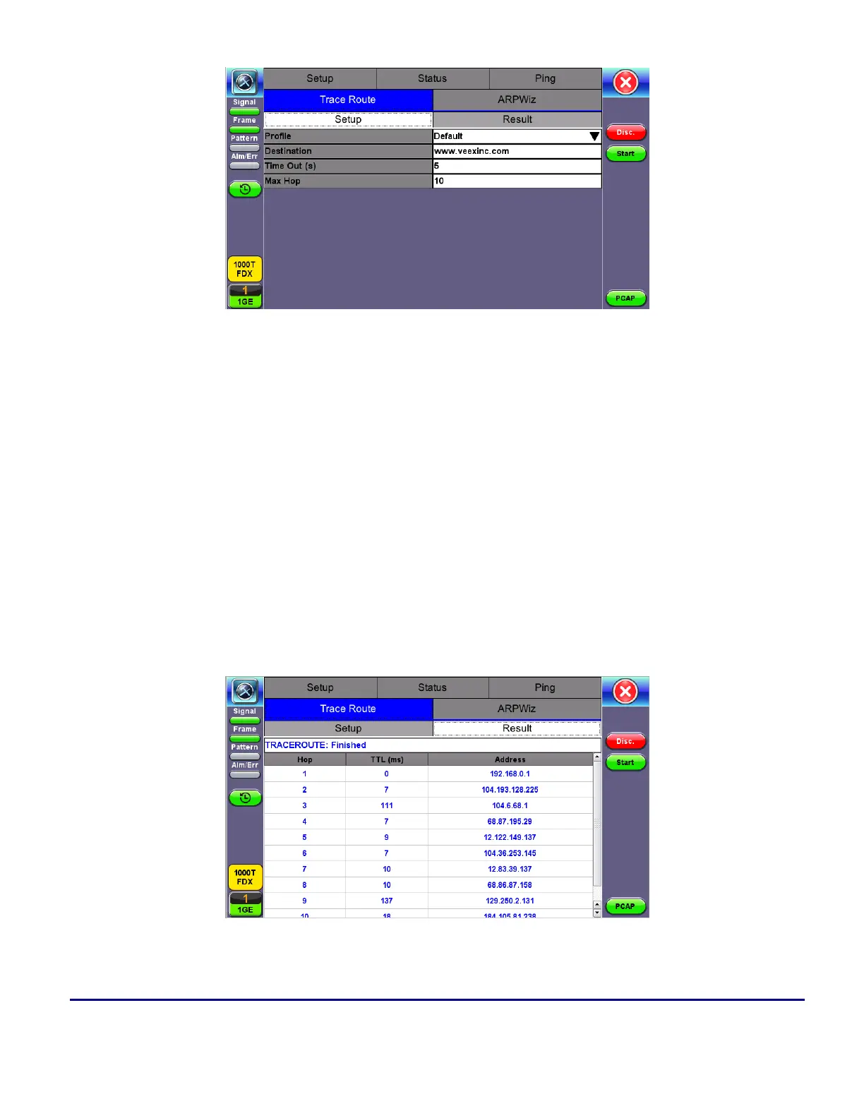 Profile: Delete, Save, Save as..., Default. Select Default to recall a trace route file or create a new