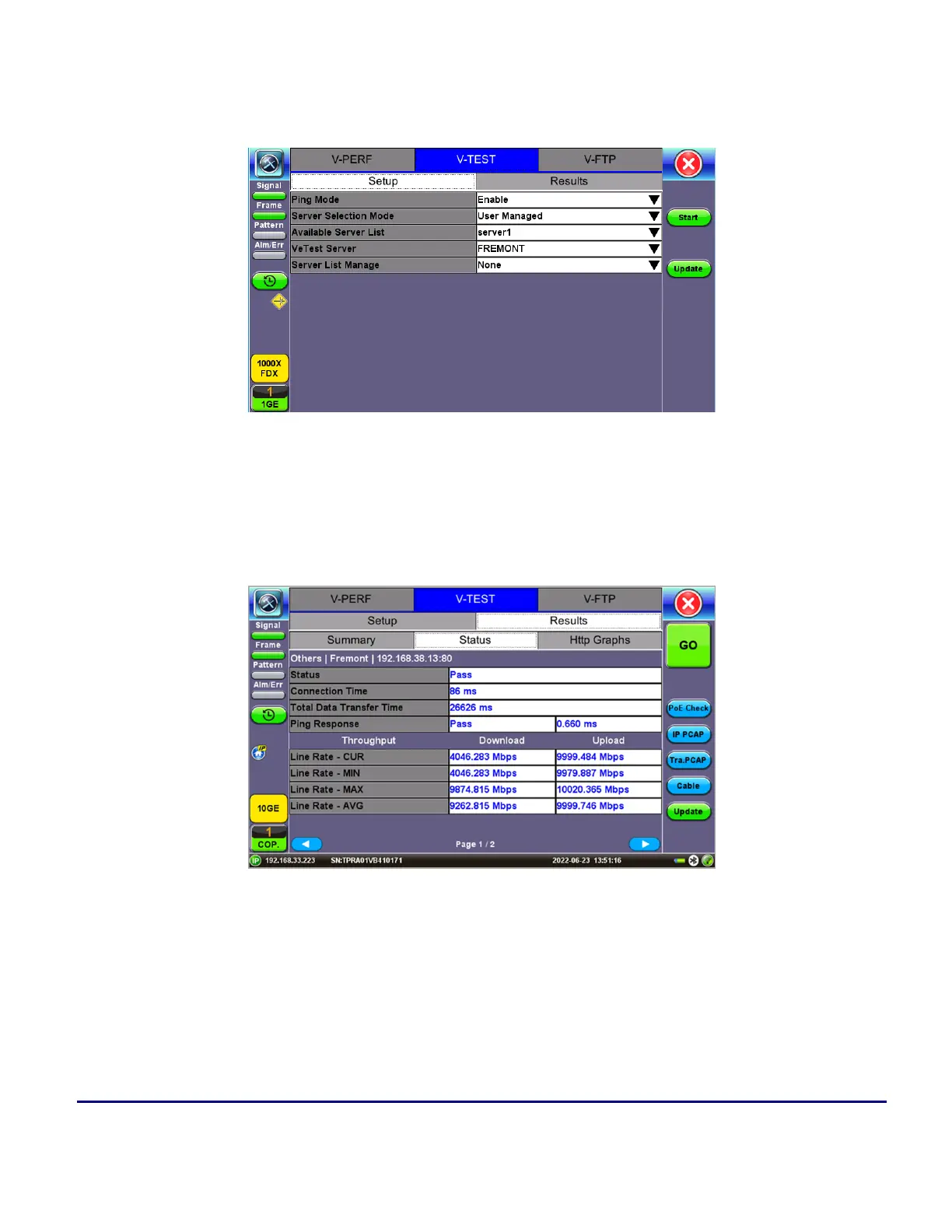 Select a server from User Managed or VeEX Managed. Enabling Ping mode simultaneously runs a Ping test.