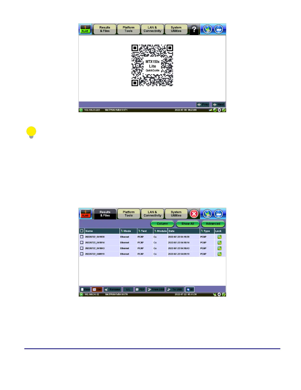 VeEX MTX150x Lite - Results & Files; File Manager