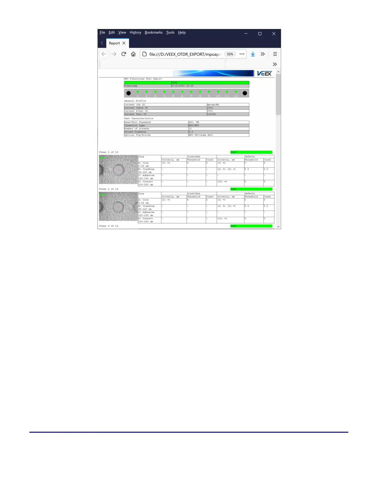 Fiberscope MPO endface test viewed in an HTML browser
