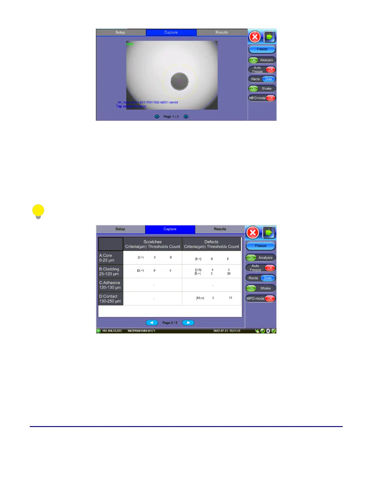 the evaluation of the Pass/Fail criteria, according to the IEC 61300-3-35 standard. (Scratch requirements refer