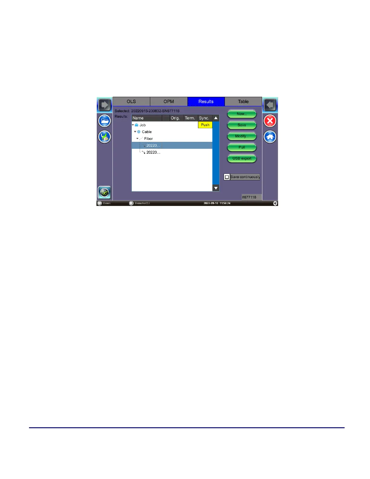 Results can be saved to the test set, exported to USB, or uploaded to Fiberizer Cloud