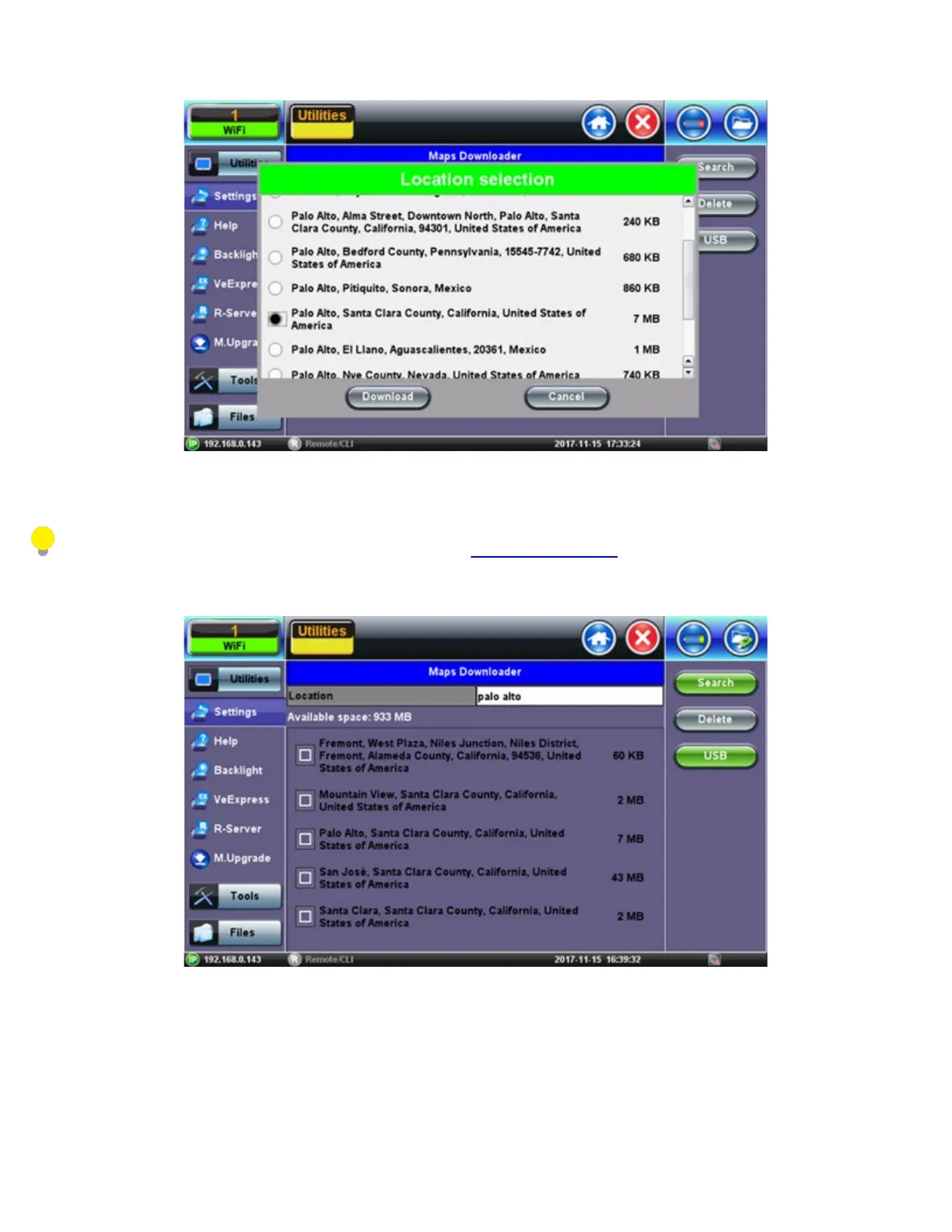 After downloading the map, the unit shows a list of all the downloaded maps. Maps can also be deleted or transferred to and from a