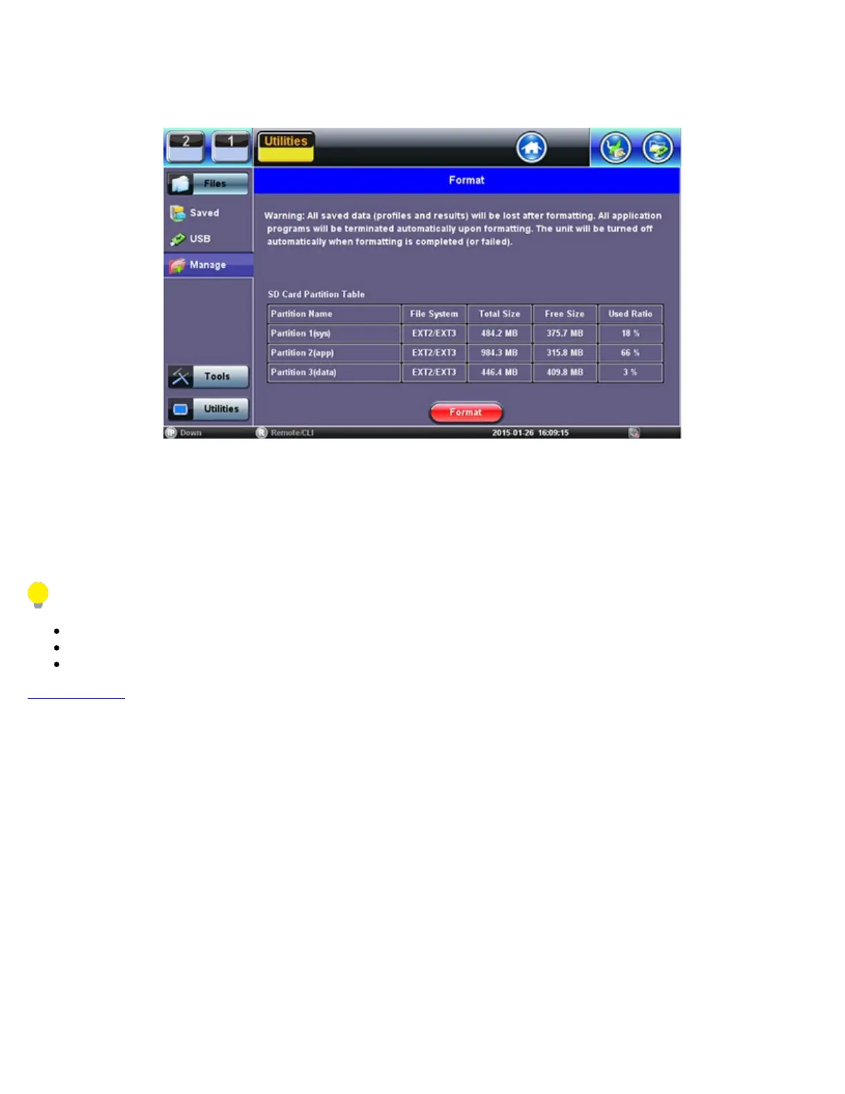 The Format function is exclusively a maintenance tool. Use ONLY when instructed by a VeEX Customer Care representative. It