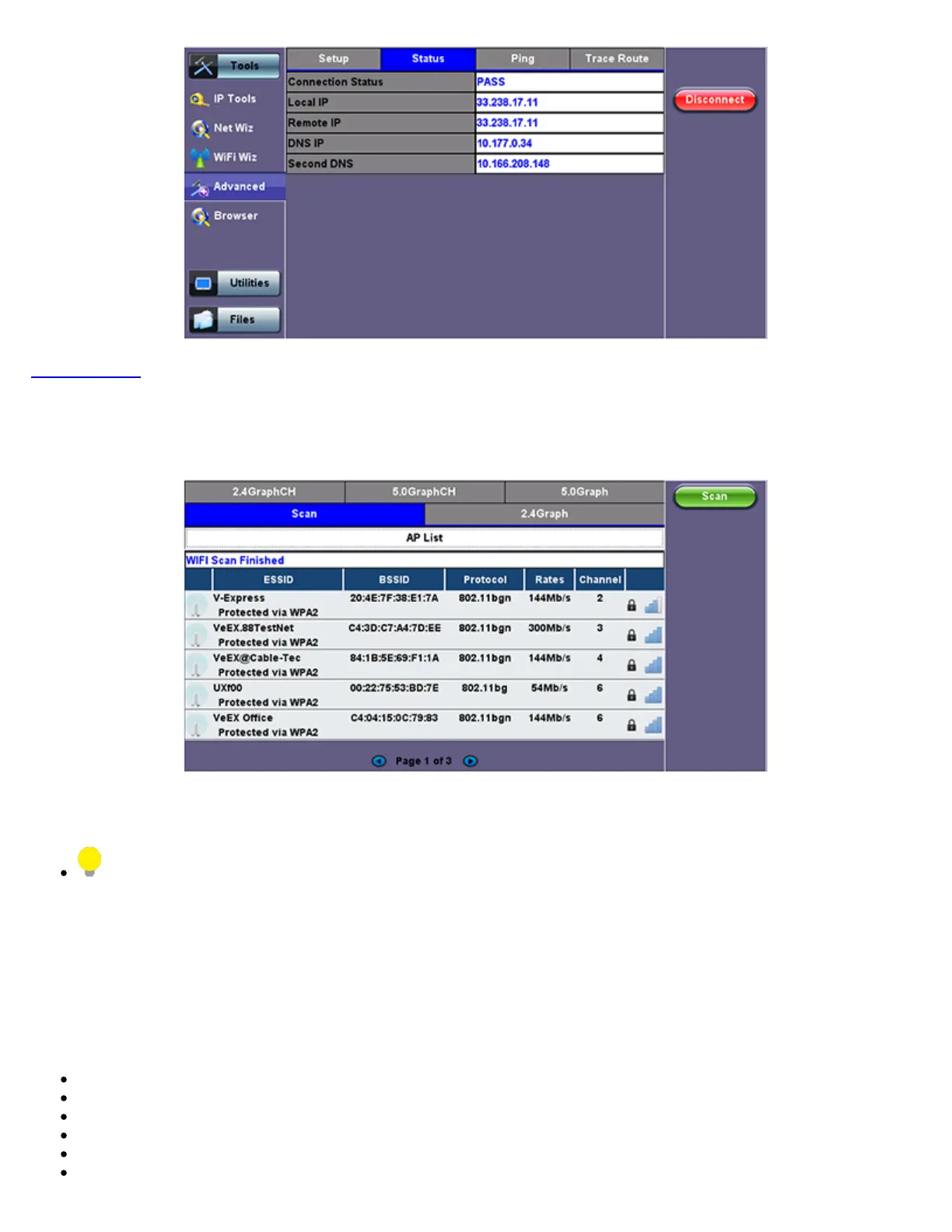 After the scan is completed, the unit displays the list of access points (AP) detected in the 2.4 GHz and 5GHz bands.