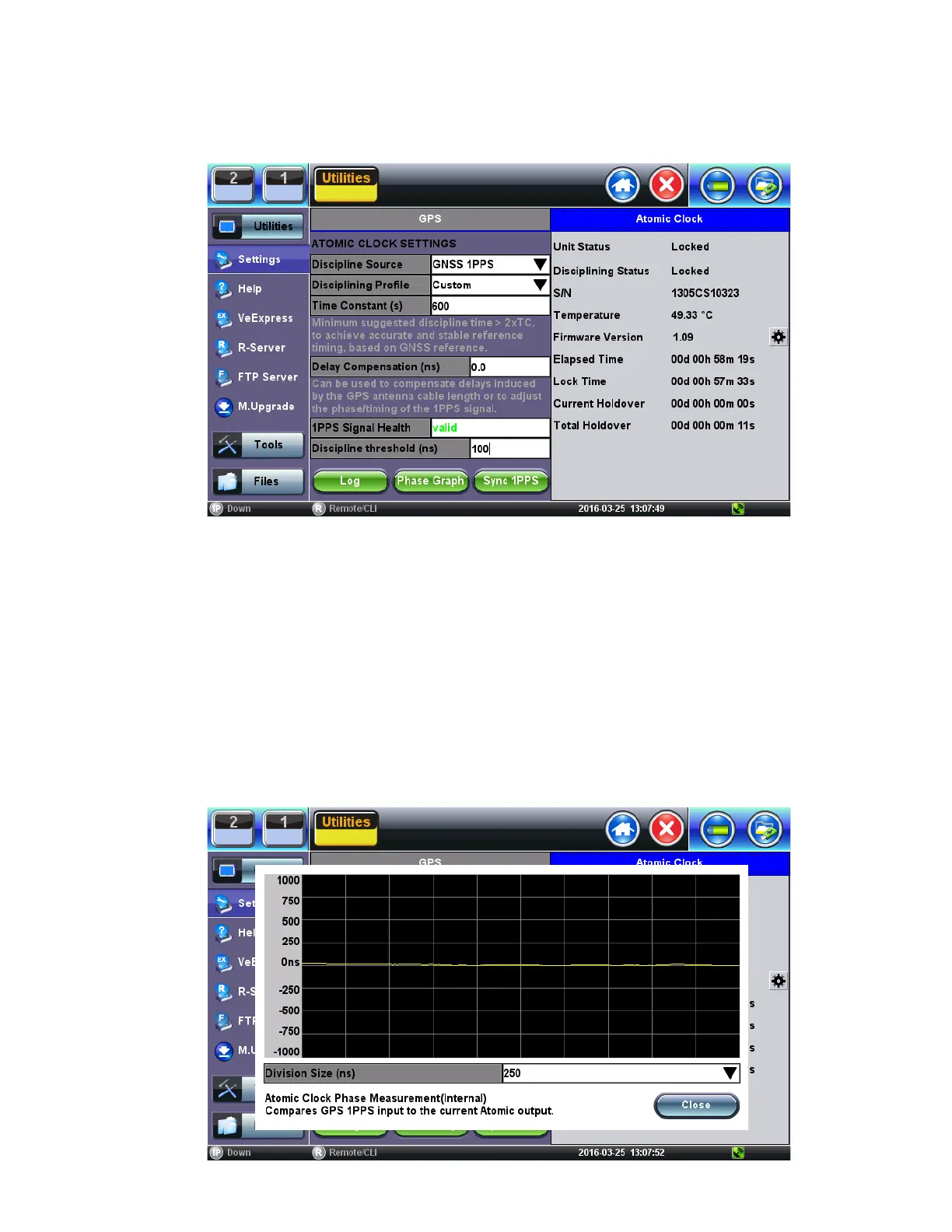 1. With the GNSS module already locked, go to >Utilities >Settings >More >High Precision Clock >Atomic Clock.