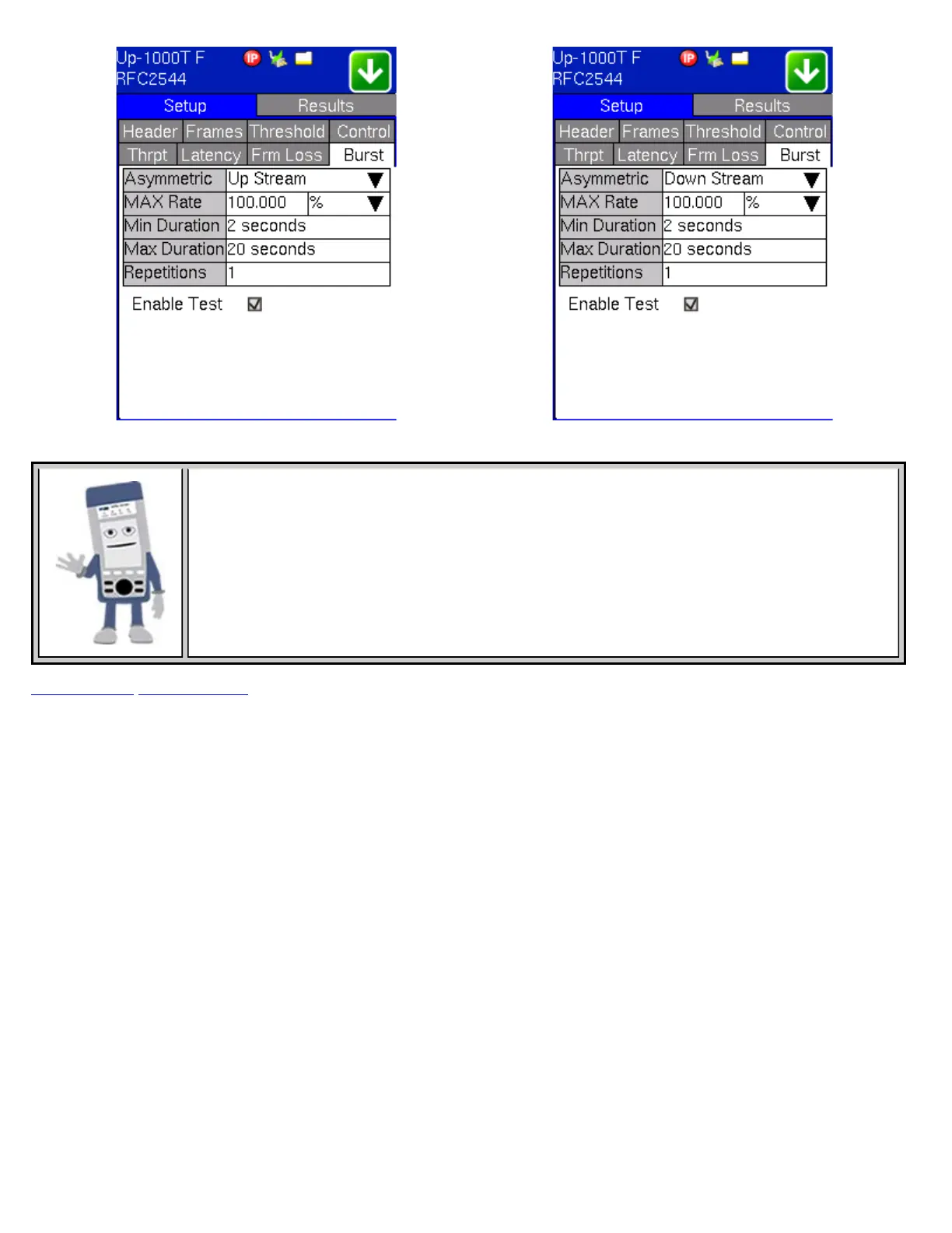 Depending on the Control Mode selected (e.g. Asymmetric mode), test settings for upstream and