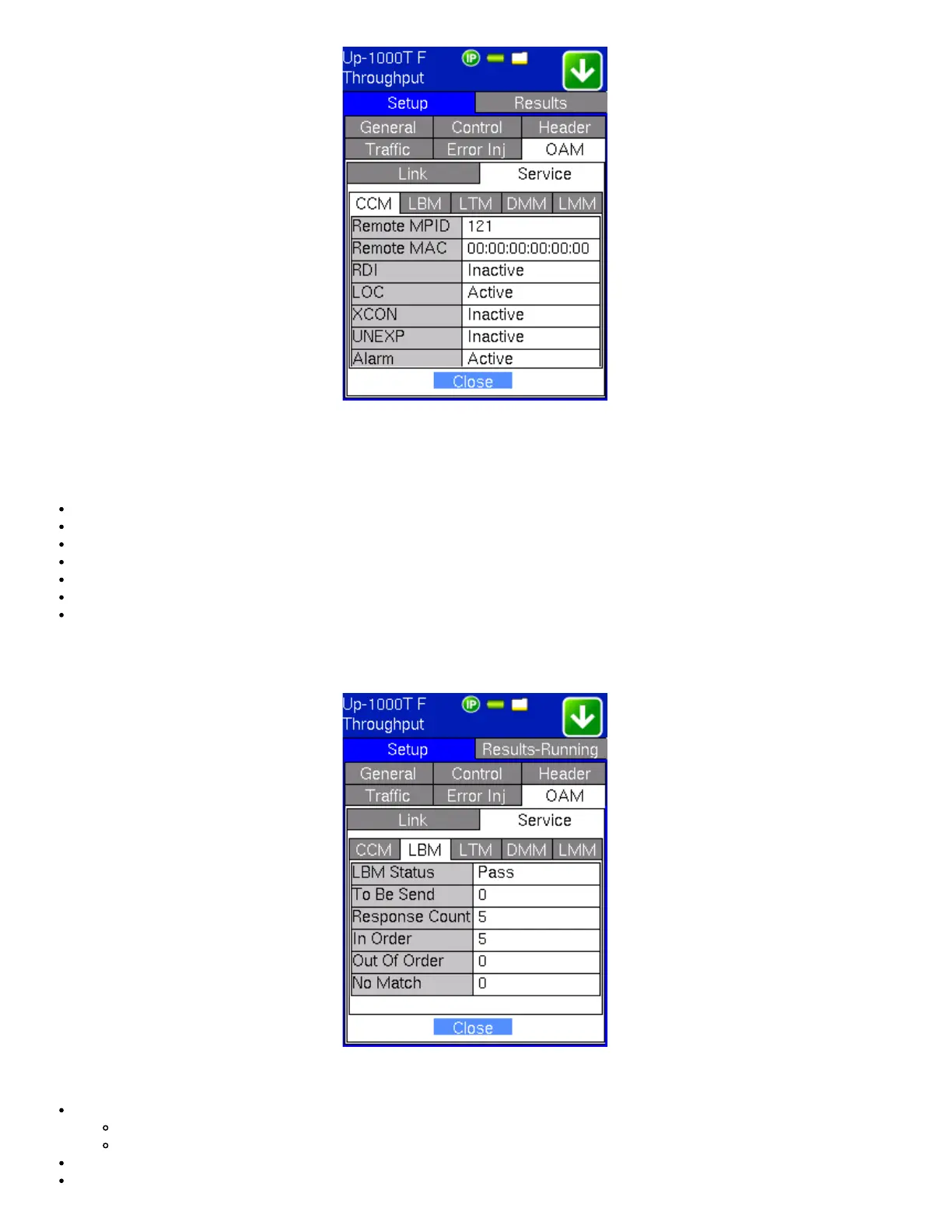 RDI, LOC, XCON, UNEXP, and Alarm will display an Inactive or Active status.