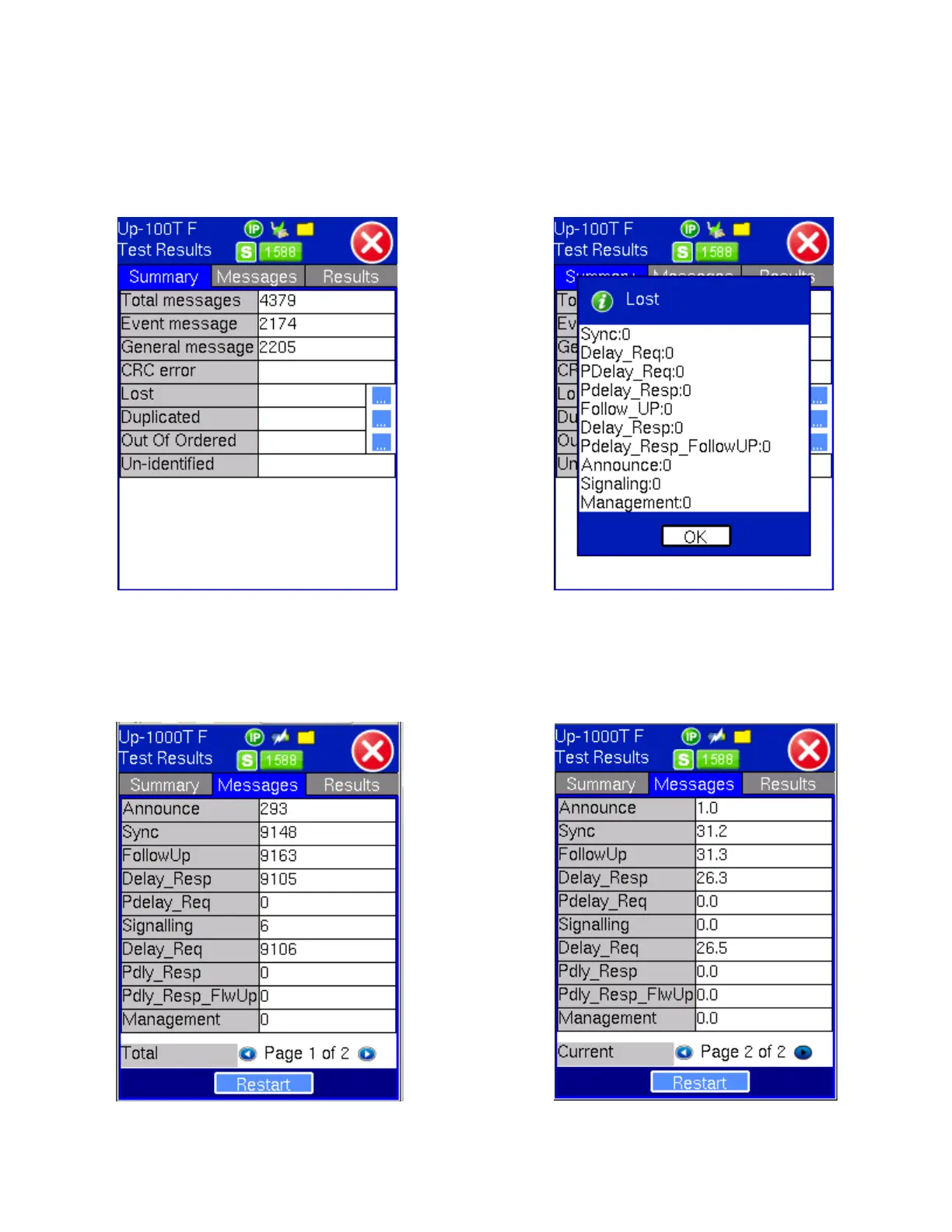Restart tab at the bottom of the Messages screen clears the counter and restarts the test.