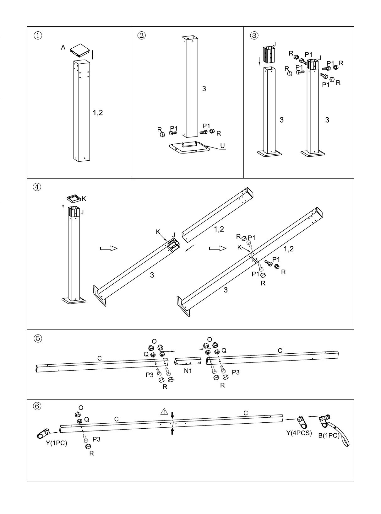 Attach decorative circle (K) to post (3), and attach post (1 & 2) to post (3) by bolt (P1) and bolt cap (R)