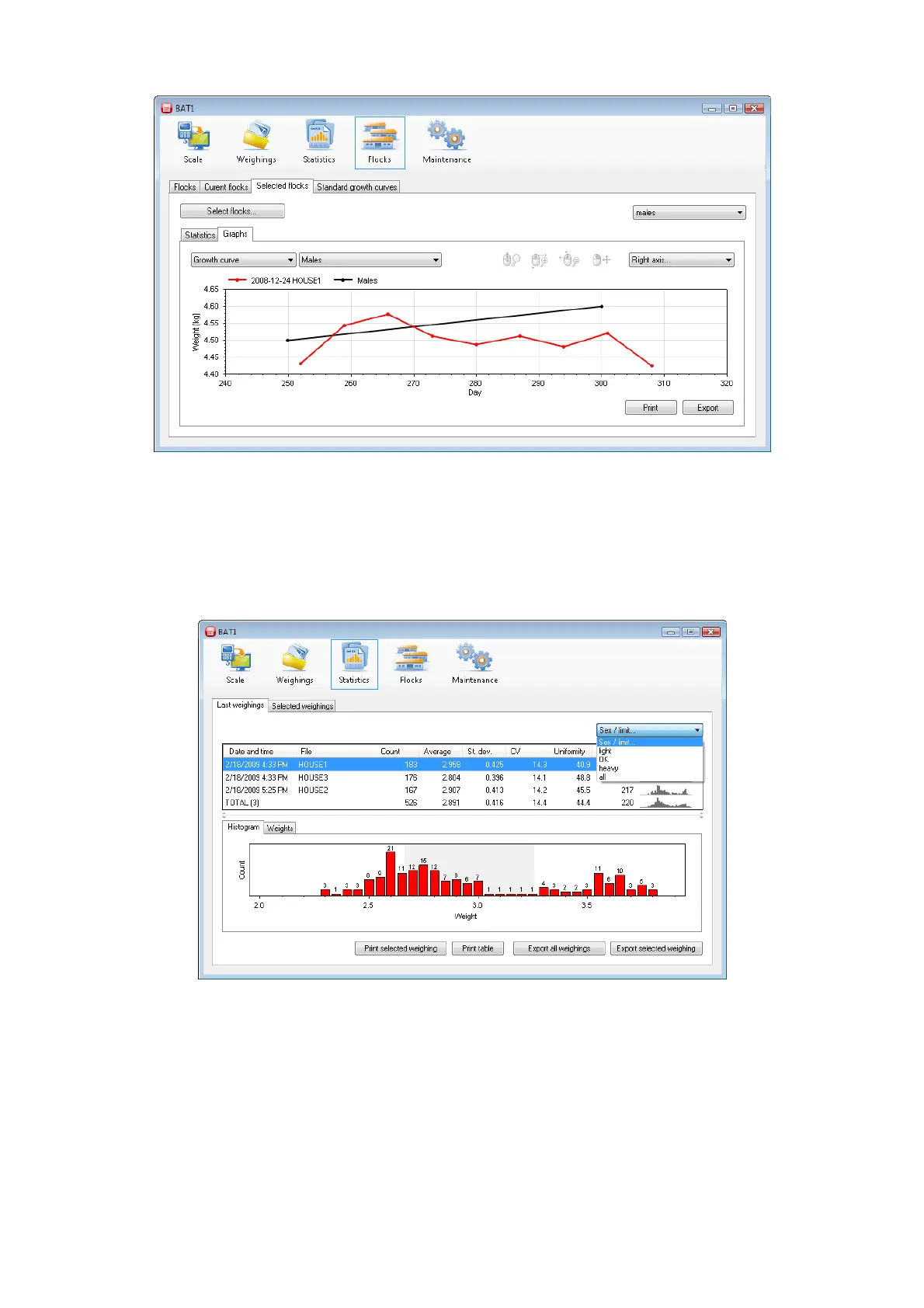 Select for example light in the field with text Sex/limit. The table of weighings, histogram, and the list of