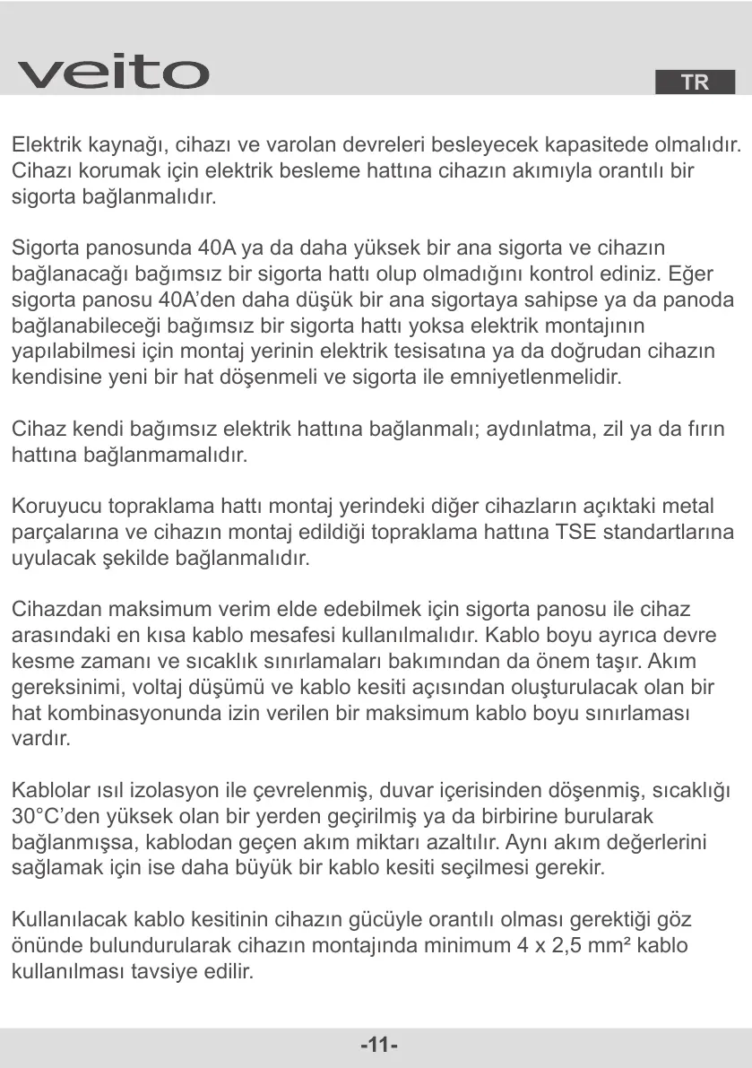 önünde bulundurularak cihazın montajında minimum 4 x 2,5 mm² kablo