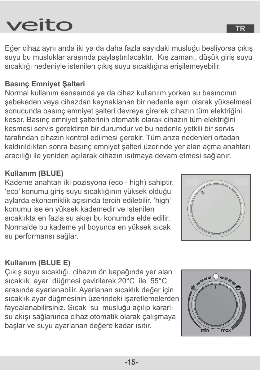 sıcaklık ayar düğmesi çevirilerek 20°C ile 55°C