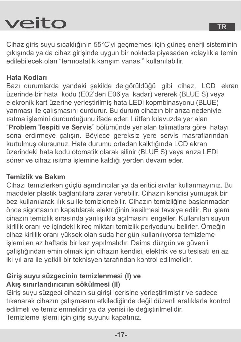 üzerinde bir hata kodu (E02’den E06’ya kadar) vererek (BLUE S) veya
