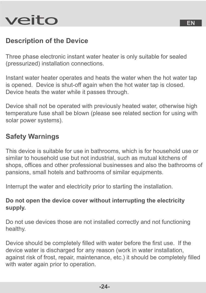 Cihaz, önceden ısıtılmış suyla çalıştırılamaz, aksi halde yüksek sıcaklık