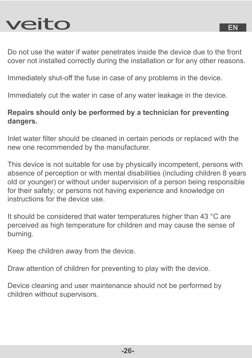 Inlet water filter should be cleaned in certain periods or replaced with the