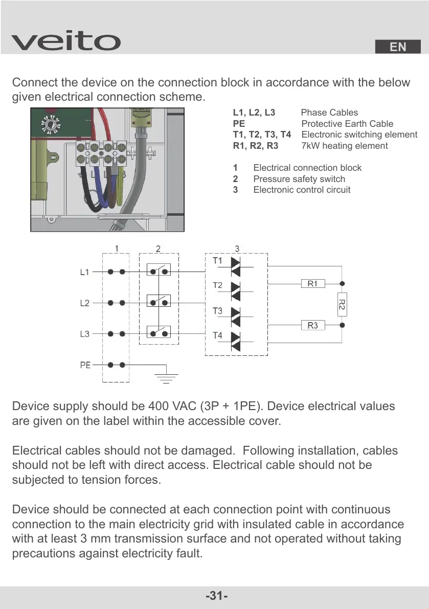 Device supply should be 400 VAC (3P + 1PE). Device electrical values