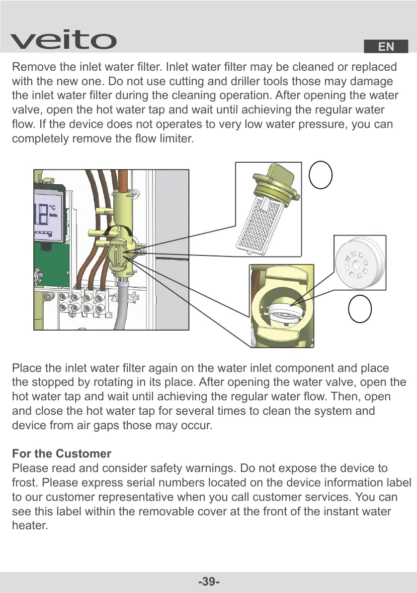 Remove the inlet water filter. Inlet water filter may be cleaned or replaced