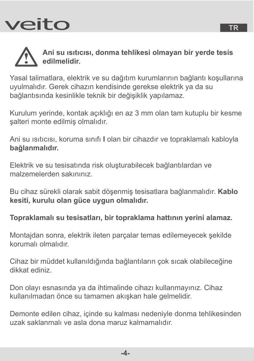 Ani su ısıtıcısı, koruma sınıfı I olan bir cihazdır ve topraklamalı kabloyla