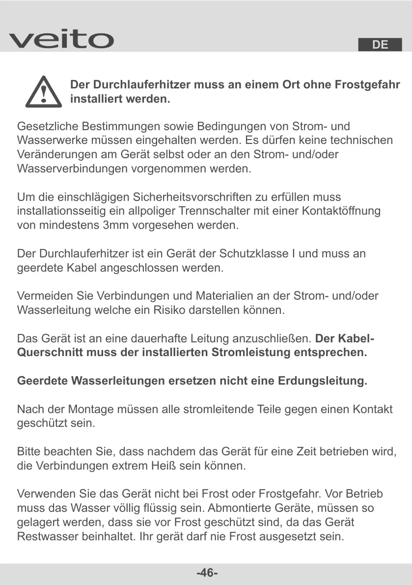 Der Durchlauferhitzer ist ein Gerät der Schutzklasse I und muss an
